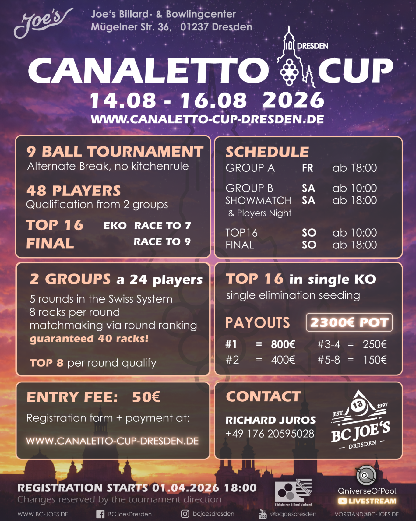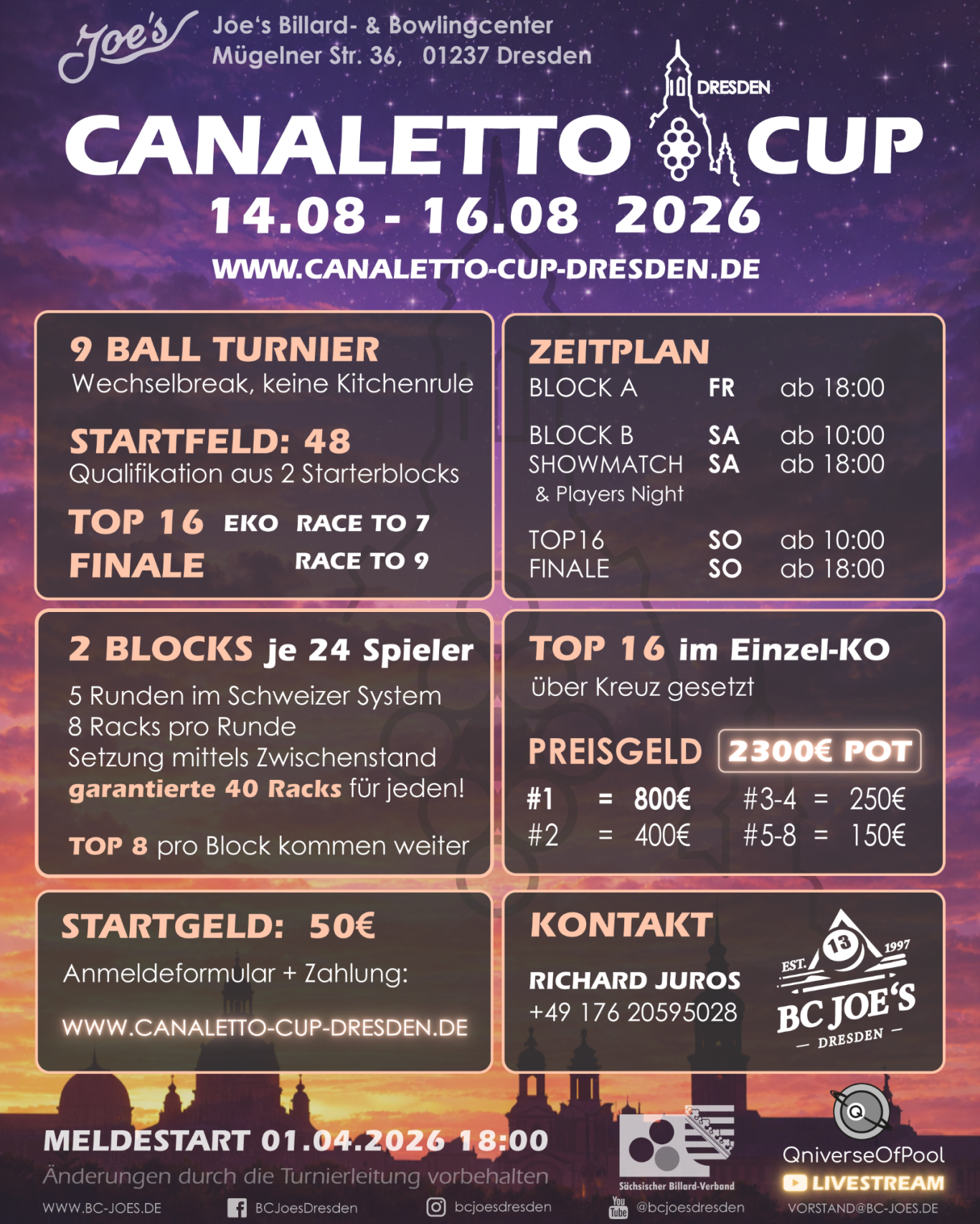 Weitere Details zum Turnierablauf senden wir den Teilnehmern im Turnierguide zu.